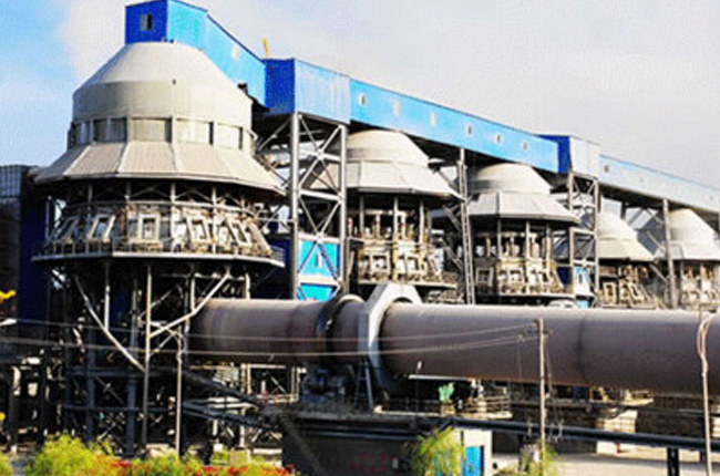 合格的石灰石存放在料仓内,经提升机提升并运入预热器顶部料仓。预热器顶部料仓,由上下2个料位计控制加料量,然后通过下料管将石灰石均匀分布到预热器各各室内。石灰石在预热器被1150°C窑烟气加热到900°C左右,约有30%分解,经液压推杆推入回转窑内,石灰石在窑内经烧结分解为CaO2和CO2。分解后生成的石灰石进入冷却器,在冷却器内被鼓入的冷空气冷却到100°C以下排出,经热交换的600°C热空气进入窑和煤气混合燃烧,废气在兑入冷风经引风机进入袋式除尘器,再经排风机进入烟囱。出冷却器的石灰经振动喂料机、链斗输送机、斗式提升机、胶带输送机送入石灰成品库。