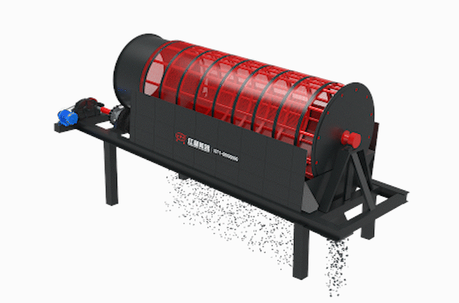 滚筒筛的电机经过减速机和滚筒装置通过联轴器链接在一起,通过驱动滚筒装置围绕其轴线转动,当物料进入滚筒装置后倾斜于转动,使物料翻转与滚动,将合格的物料经过滚筒外圆筛网排出,将不合格的物料经过滚筒末端排出,物料在滚筒内来回翻转和滚动,筛孔中的物料被弹出,可以放置筛孔堵塞。