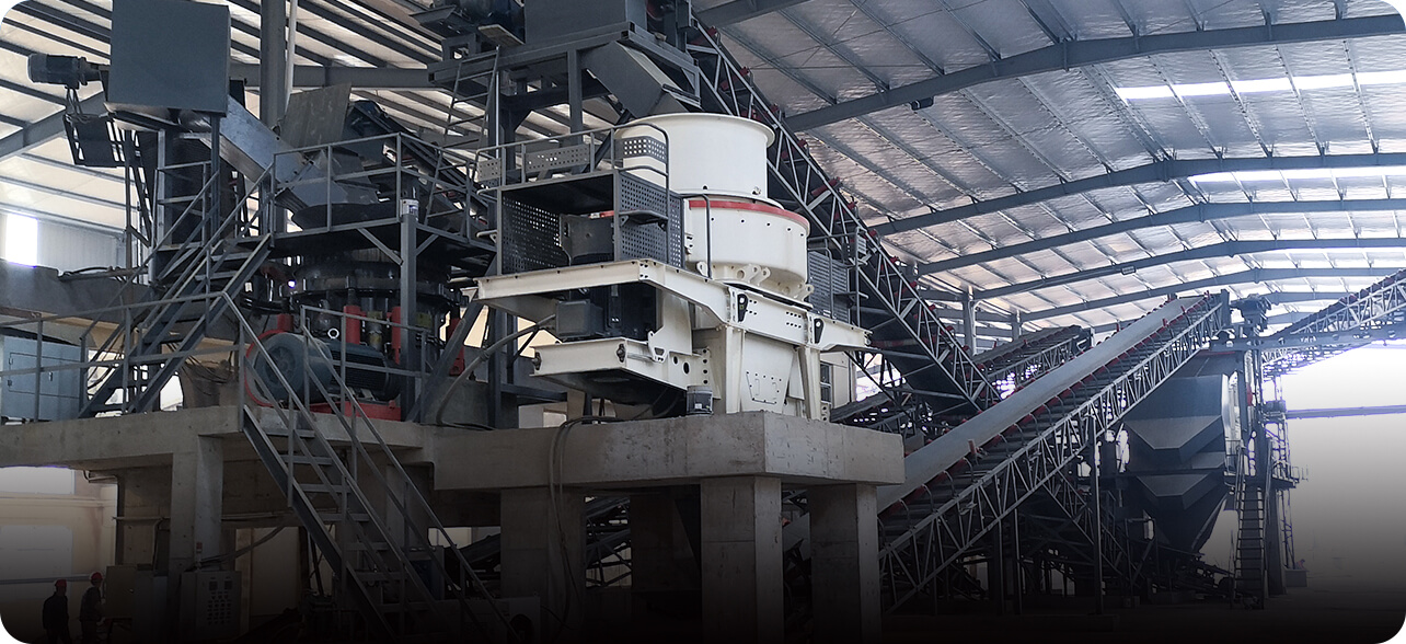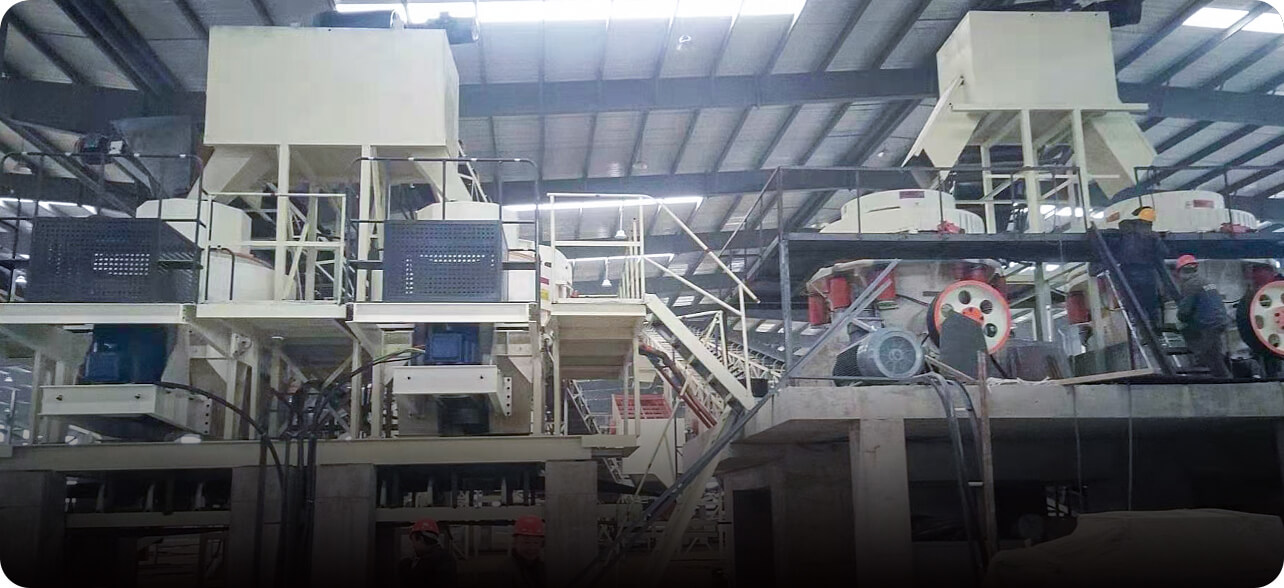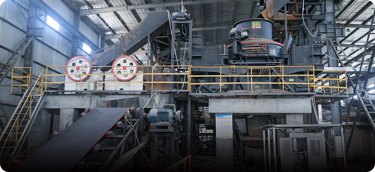 组成设备:给料机、鄂破、反击破、圆锥破、制砂机、振动筛、洗砂机、皮带输送机、集中电控设备等